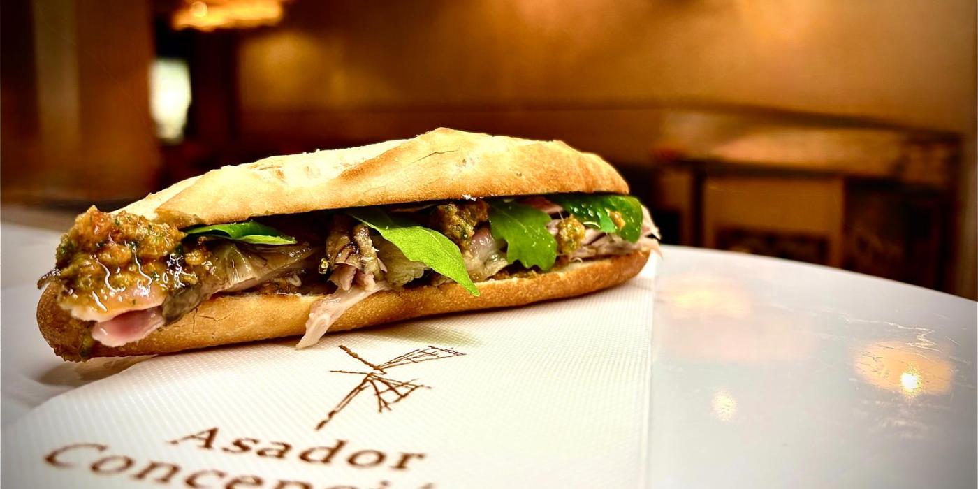Paquito de cordero lechal con pesto rosa al estilo manchego, rúcula y canónigos