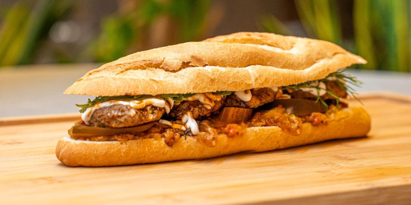 Servimos el kebap dentro de un pan vietnamita (banh mi) con baingan bharta, yogur, berenjena encurtida, melaza de dátiles, hierbabuena y eneldo.