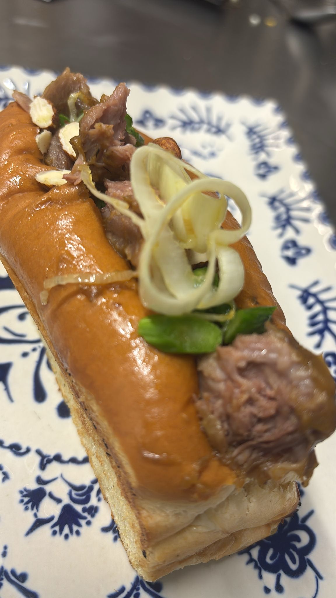 Se prepara el cordero estofado, y se presenta el mismo en pan brioche, acompañado de puerros y espárragos salteados con almendras y salsa de queso manchego.