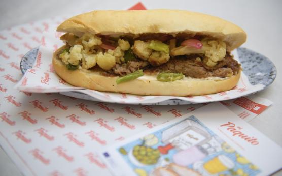 Se unta el pan con ajoaceite, se marcha en la plancha a fuego vivo unas láminas del cordero para que deje muy crujiente y tostadito por fuera, ponemos encima el trinchat de col , mojamos con la reducción de los jugos y añadimos algún encurtido (cebolla Y piparra)