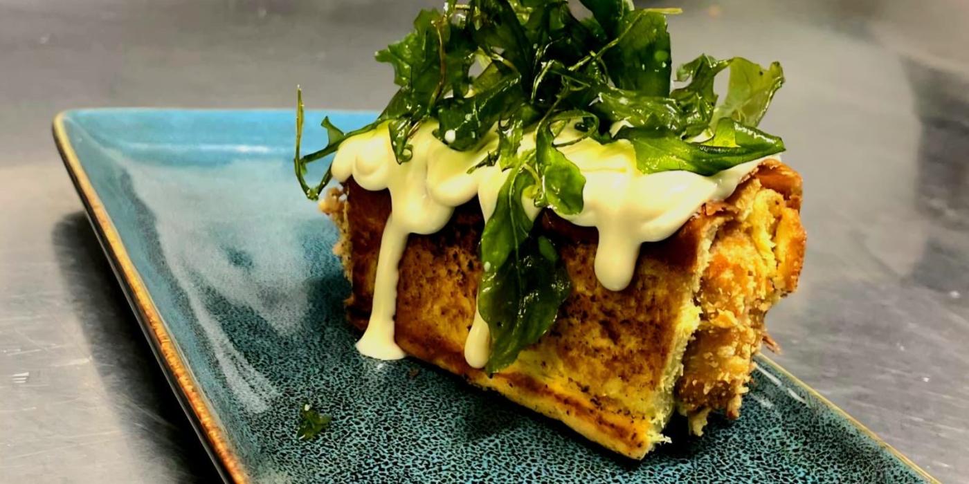Lingote de cordero: Hemos decidido utilizar pierna de cordero que envasamos al vacío con aceite de ajo, sal, pimienta, laurel y ajo y cocinamos a 65 grados durante 12 horas. Una vez hecha la cocción deshuesamos y metemos en un molde hasta fraguar con la forma de nuestro pan brioche. Por último pasaremos por harina, huevo y panko y freiremos.