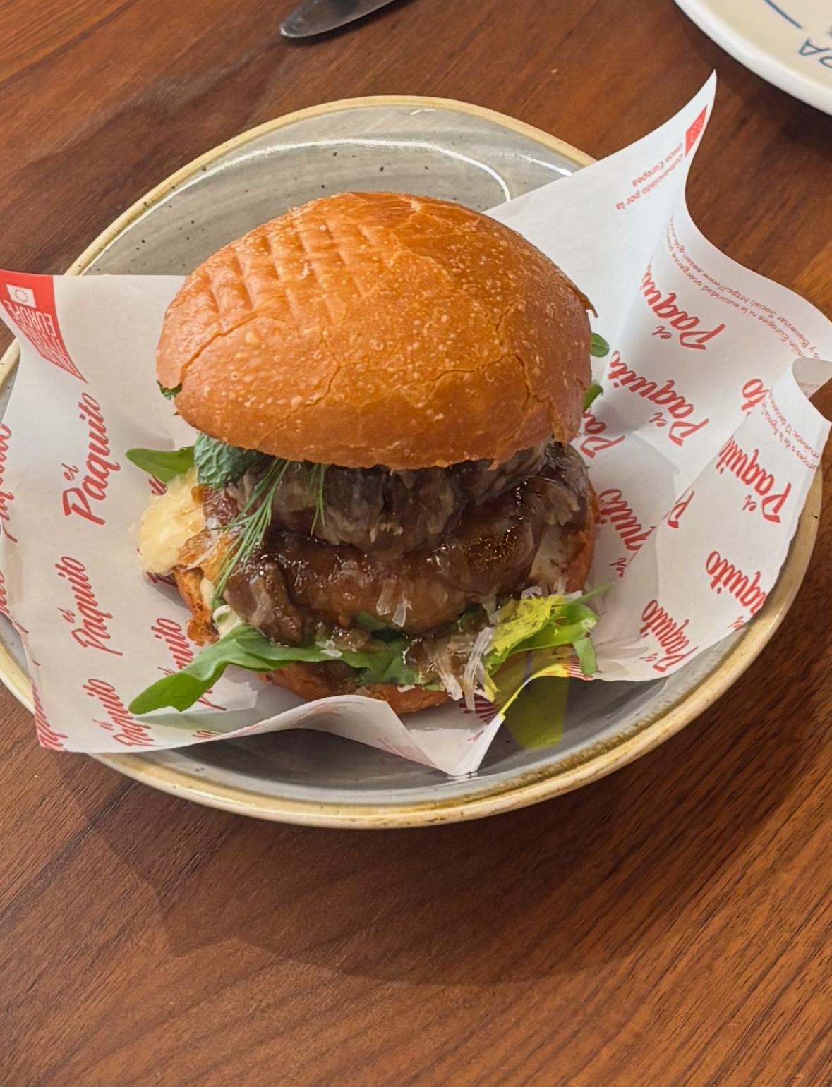 Para el montaje necesitamos un pan tipo burger pequeñito, una mayonesa, con ajo y cebolla pochada. La hamburguesita con su jugo, queso de oveja rallado, hojas frescas, cebollino, menta y perejil.