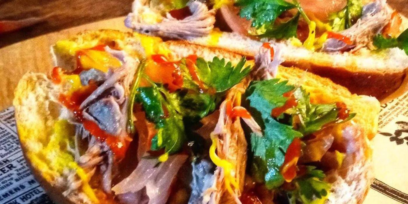 Taco de pan de brioche con cuello de cordero a baja temperatura, chutney de manzana y topping de cebolla roja, cilantro y mostaza.