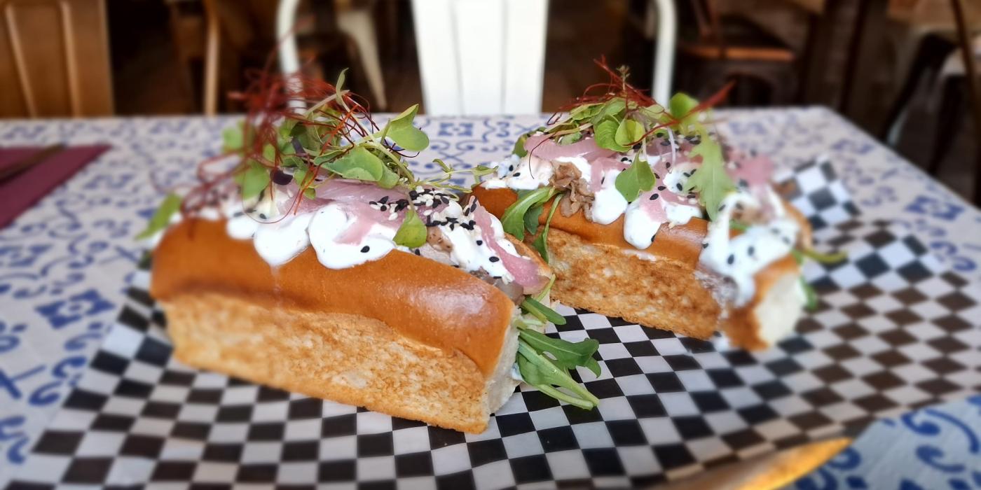 Es un brioche artesano relleno de salsa de yogur griego, rúcula y cordero a baja temperatura. Va terminado con semillas de sésamo, mixto de brotes cebolla roja encurtida e hilos de chile.