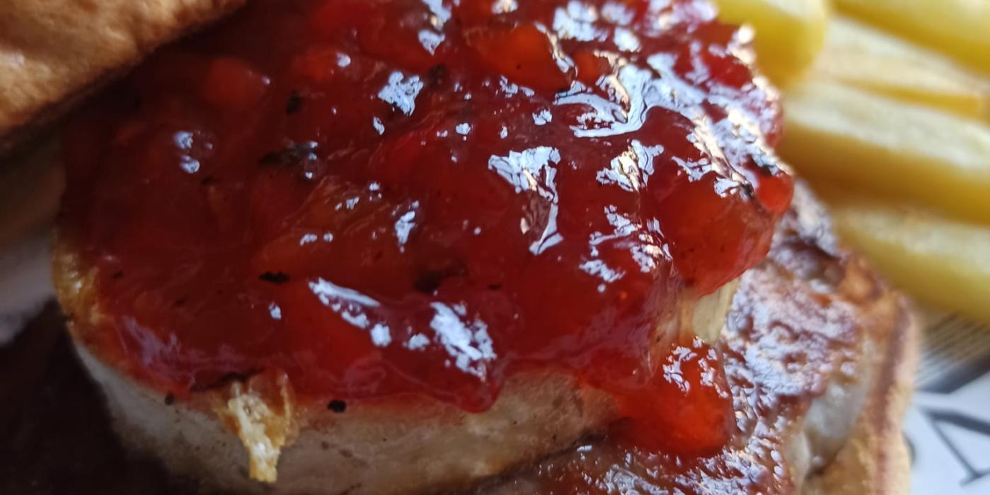 Hamburguesa de cordero manchego, queso de cabra y mermelada de pimiento