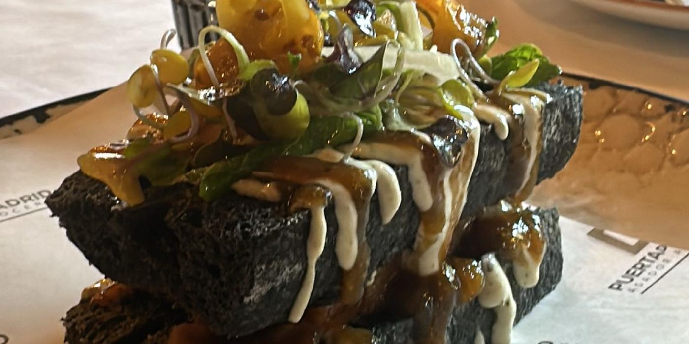 Por otro lado, metemos la plancha de cordero al horno con el jugo que hemos hecho con los huesos. Lo ponemos encima una rebanada del pan lo echamos un poquito chutney salsa de yogur y tapamos con la otra rebanada y decoramos con una mini ensalada de brotes verdes, piparras encurtidas, menta, pepino y cebolleta y por último añadimos más chutney y salsa de yogur.