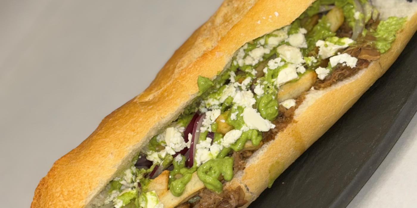 Cordero a baja temperatura en su jugo con cebolla morada, queso feta y nuestra mayonesa verde a base de aguacates
