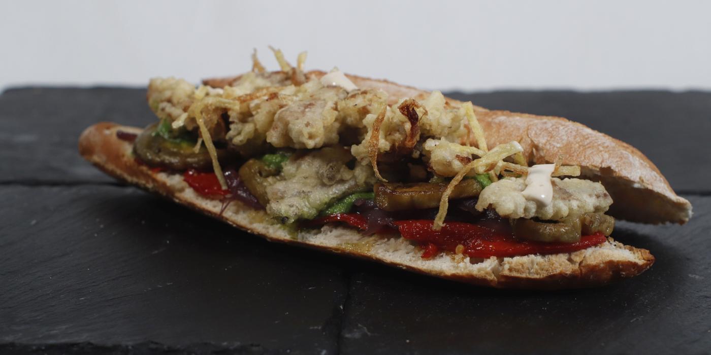 Pan recién horneado, servido con pierna de cordero manchego lechal en tempura, cebolla confitada, piquillo asado, mayonesa del jugo de cordero, berenjena al horno, patatas paja, pesto de albahaca y nueces