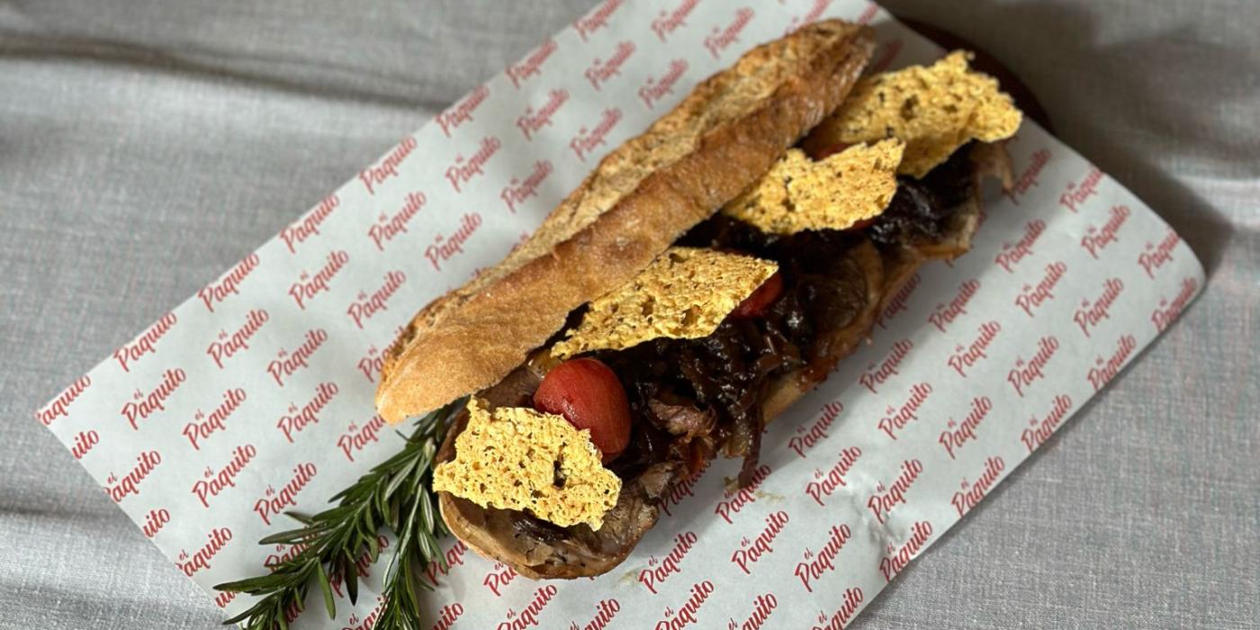 Pan rústico casero, cordero asado con boletus, mayonesa ahumada, tomate semi seco a las finas hierbas del Pallars, crujiente de queso y cebolla caramelizada.