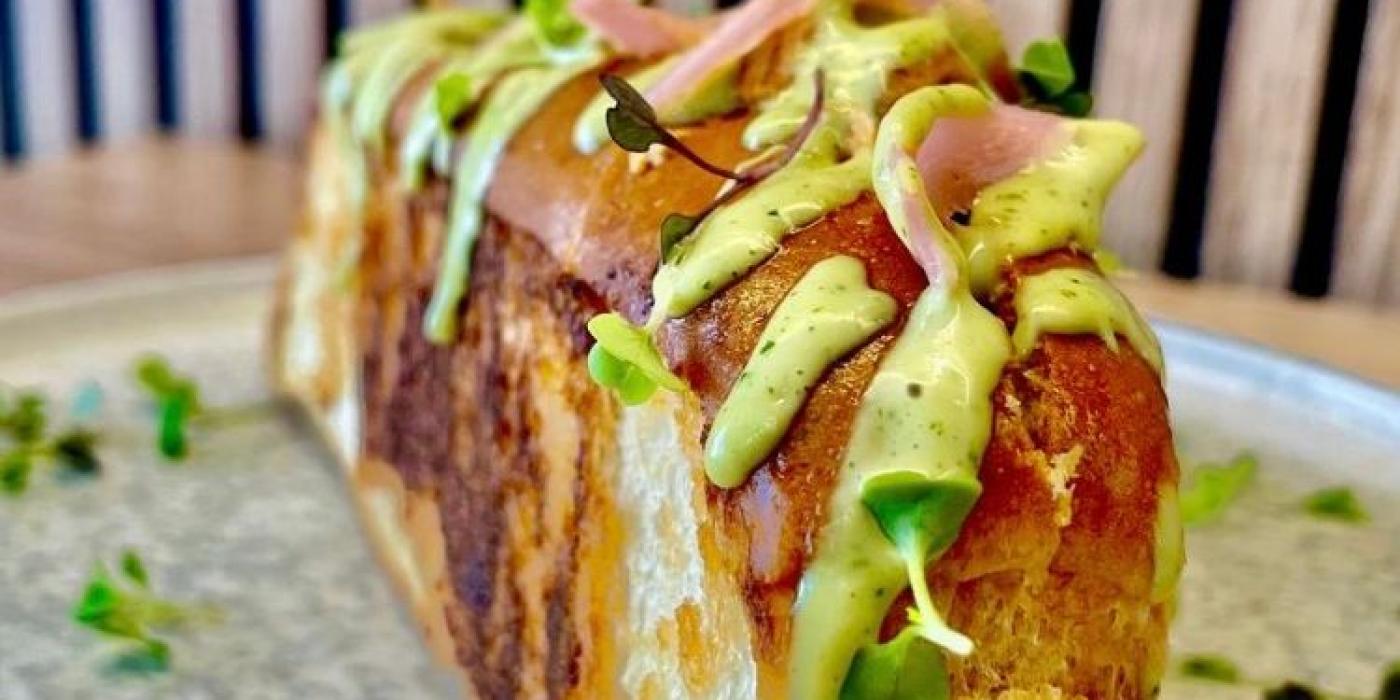 - Coronamos con un poco de cebolla encurtida, una hoja de cilantro, una hoja de hierbabuena, unas gotas de salsa hoisin y mayonesa de cilantro.