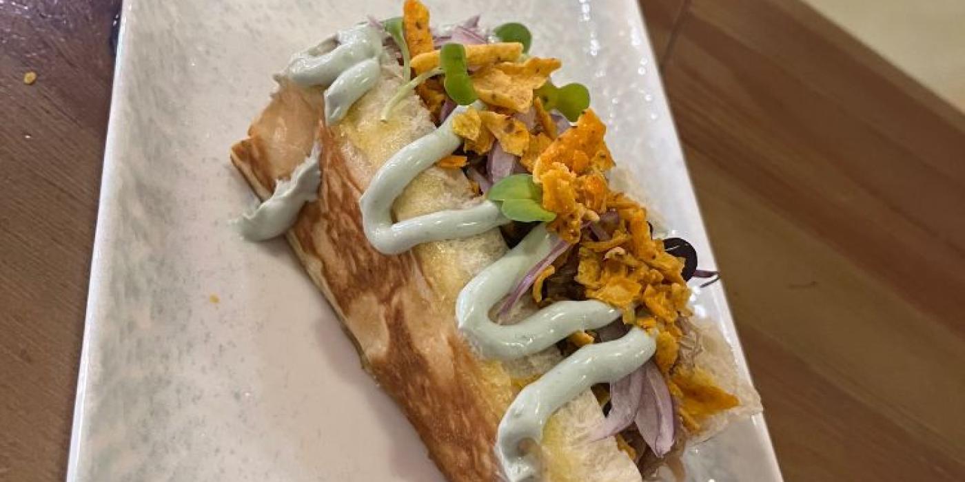 Frankfurt relleno de paletilla de cordero “IPG cordero de Extremadura”, cebolla encurtida, alioli de wakame y toque crunchy picante.