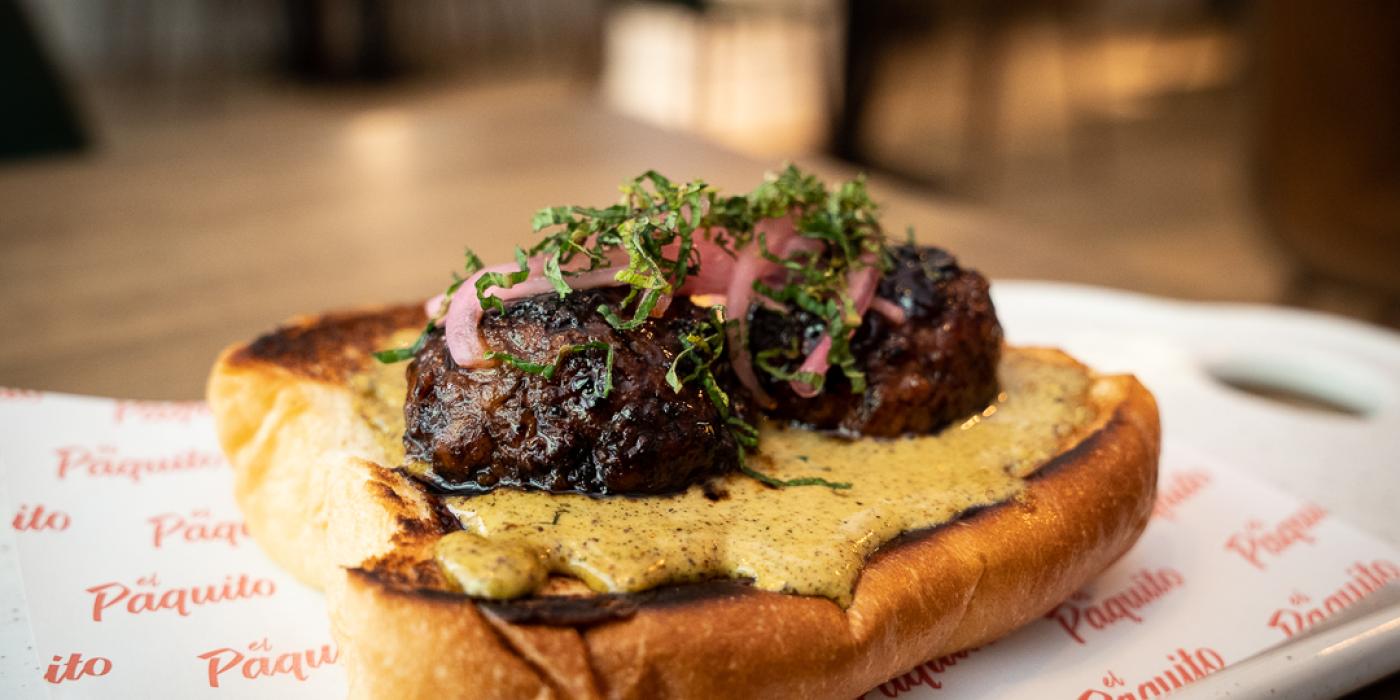Este Paquito lo creamos justo a la vuelta de un viaje a Japón en el que habíamos estado comiendo tsukune, y decidimos aplicar este concepto a la receta de nuestro particular Paquito: brioche de mantequilla tostado, mahonesa especiada, albóndigas de cordero marroquíes lacadas como un tsukune japonés, menta y cebolla encurtida.