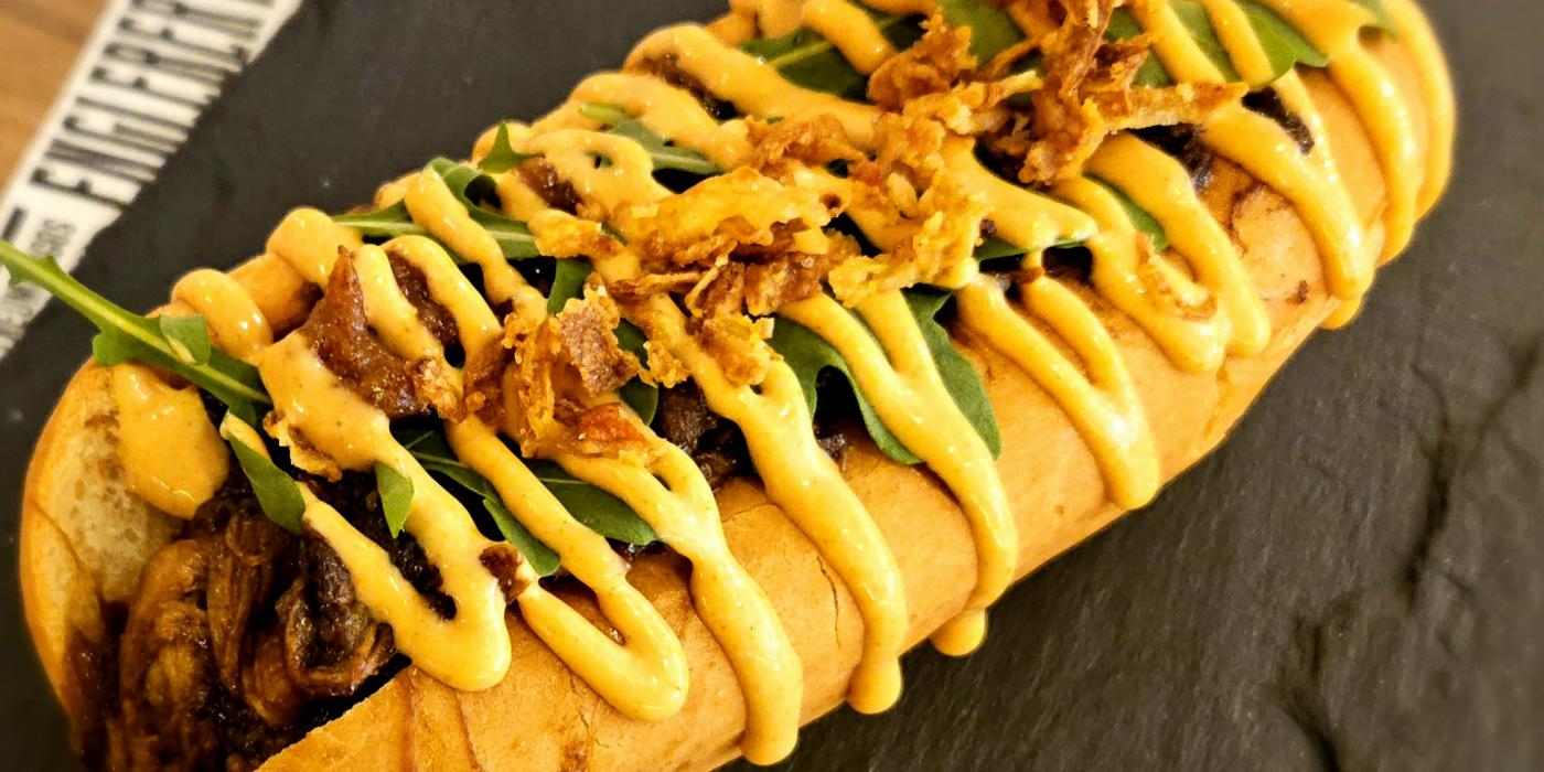 Cordero desmigado al horno con Torta de la Serena, mermelada de higos casera, rúcula, cebolla crujiente y Cremoso de la Vera, sobre pan brioche artesanal.